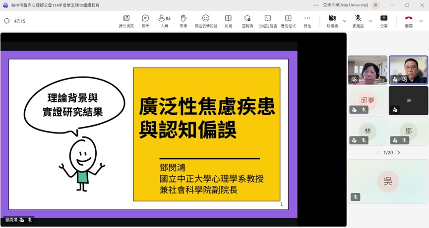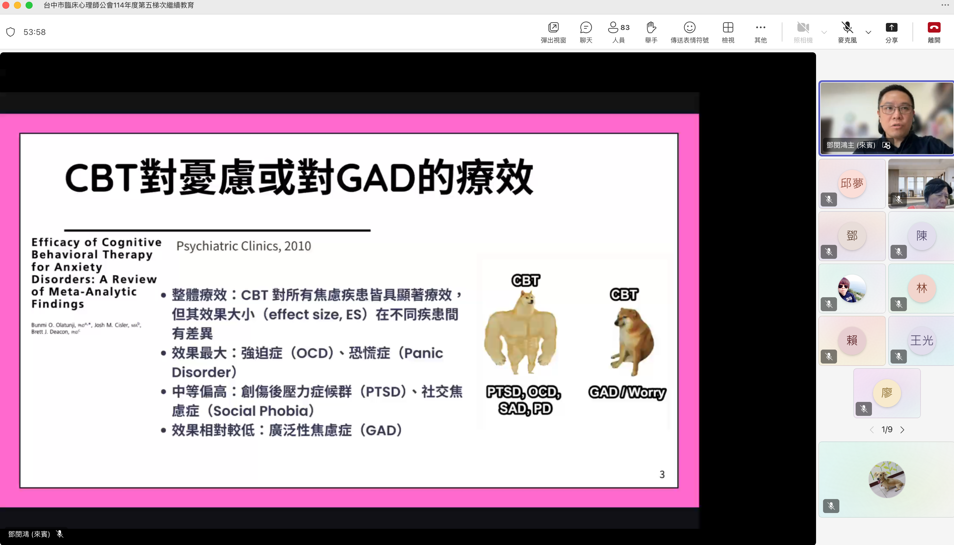 一、主辦單位:台中市臨床心理師公會 二、課程主題:GAD 實證心理治療 三、課程地點:課程地點:以 Microsoft Teams 進行線上授課 四、課程時間:2025.11.22 (六) 09:00−12:00 五、講師:鄧閔鴻 教授