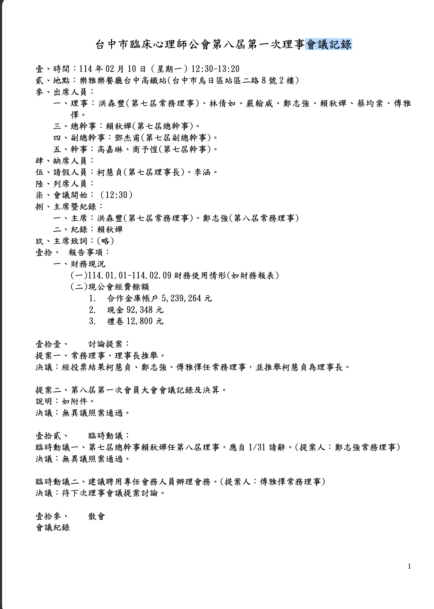 第八屆第一次理事會議紀錄