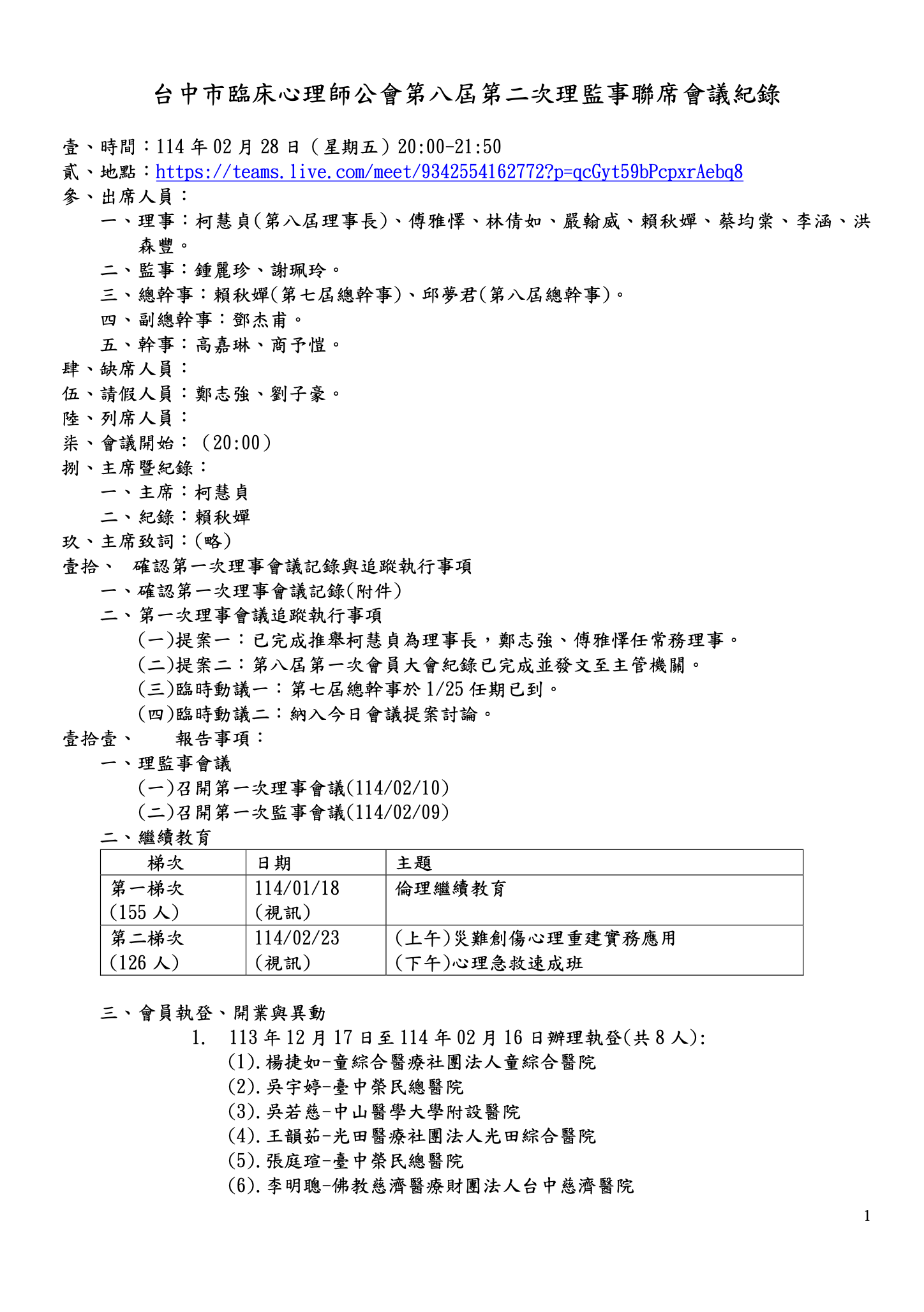 第八屆第二次理監事聯席會議紀錄