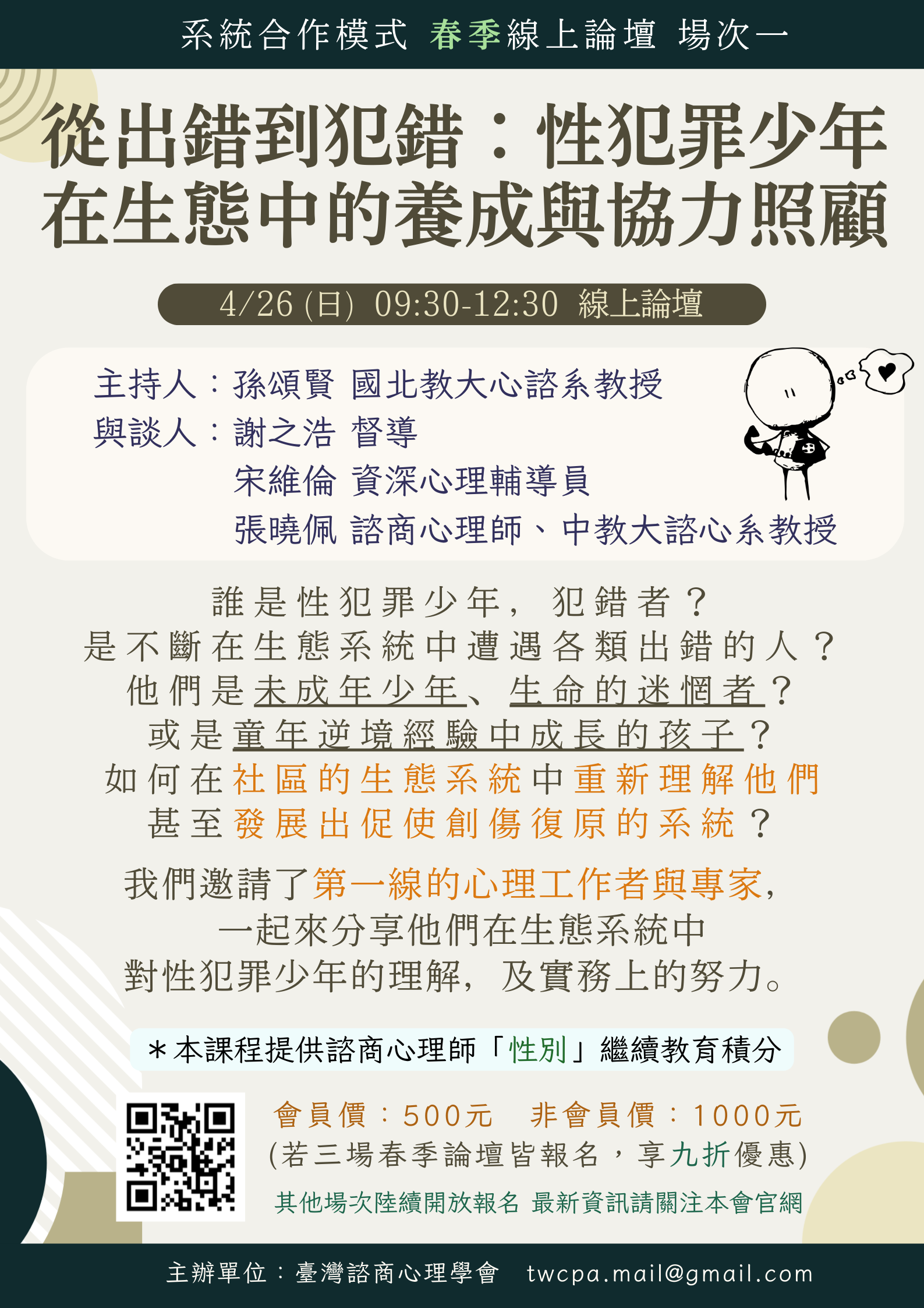 臺灣諮商心理學會−4/26 春季系統論壇場次一「從出錯到犯錯:性犯罪少年在生態中的養成與協力照顧」