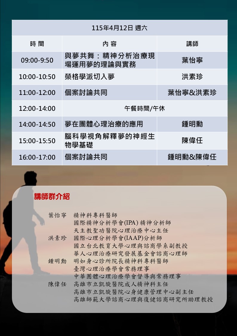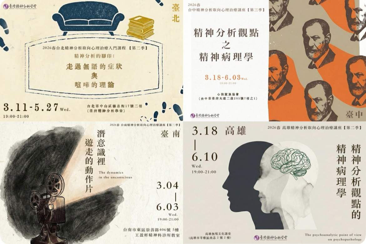 臺灣精神分析學會−2026春 台北/台中/台南/高雄精神分析取向心理治療講座