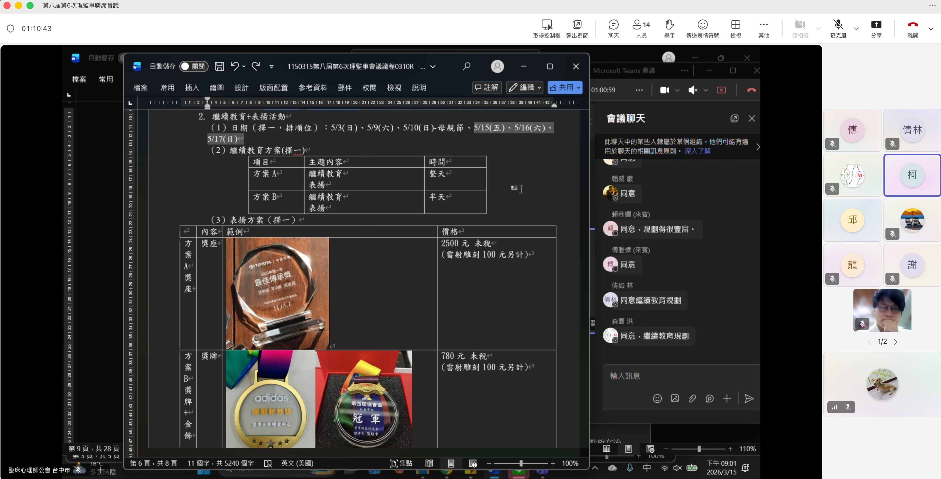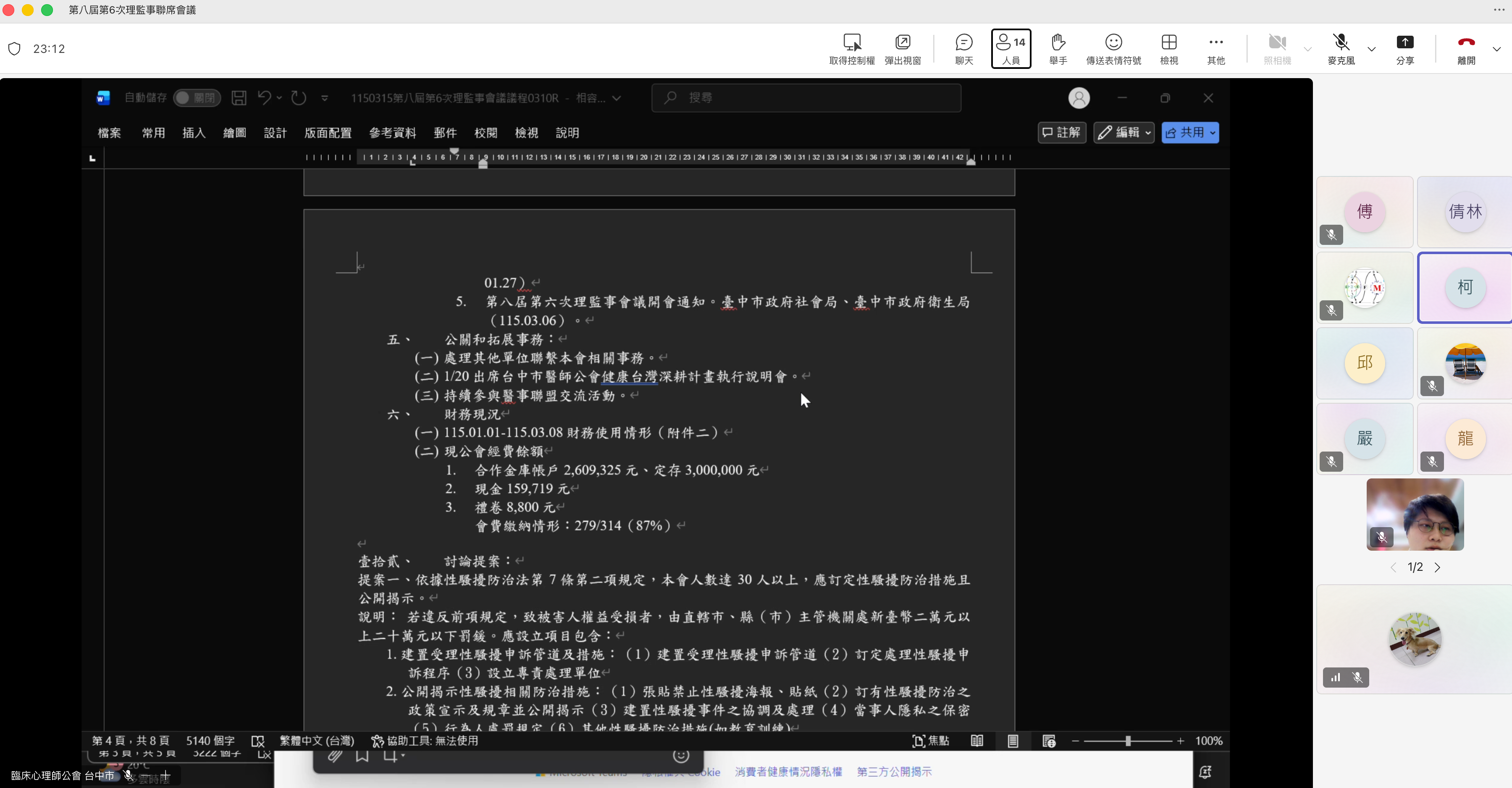 【時間】:115/3/15 (五) 20:00− 【地點】:Microsoft Teams 視訊會議 【出席人員】 一、理事:柯慧貞(理事長)、傅雅懌、林倩如、嚴翰威、賴秋嬋、蔡均棠、洪森豐。 二、監事:鍾麗珍、劉子豪、謝珮玲。 三、總幹事:邱夢君。 四、副總幹事:鄧杰甫。 五、幹事:商予愷。