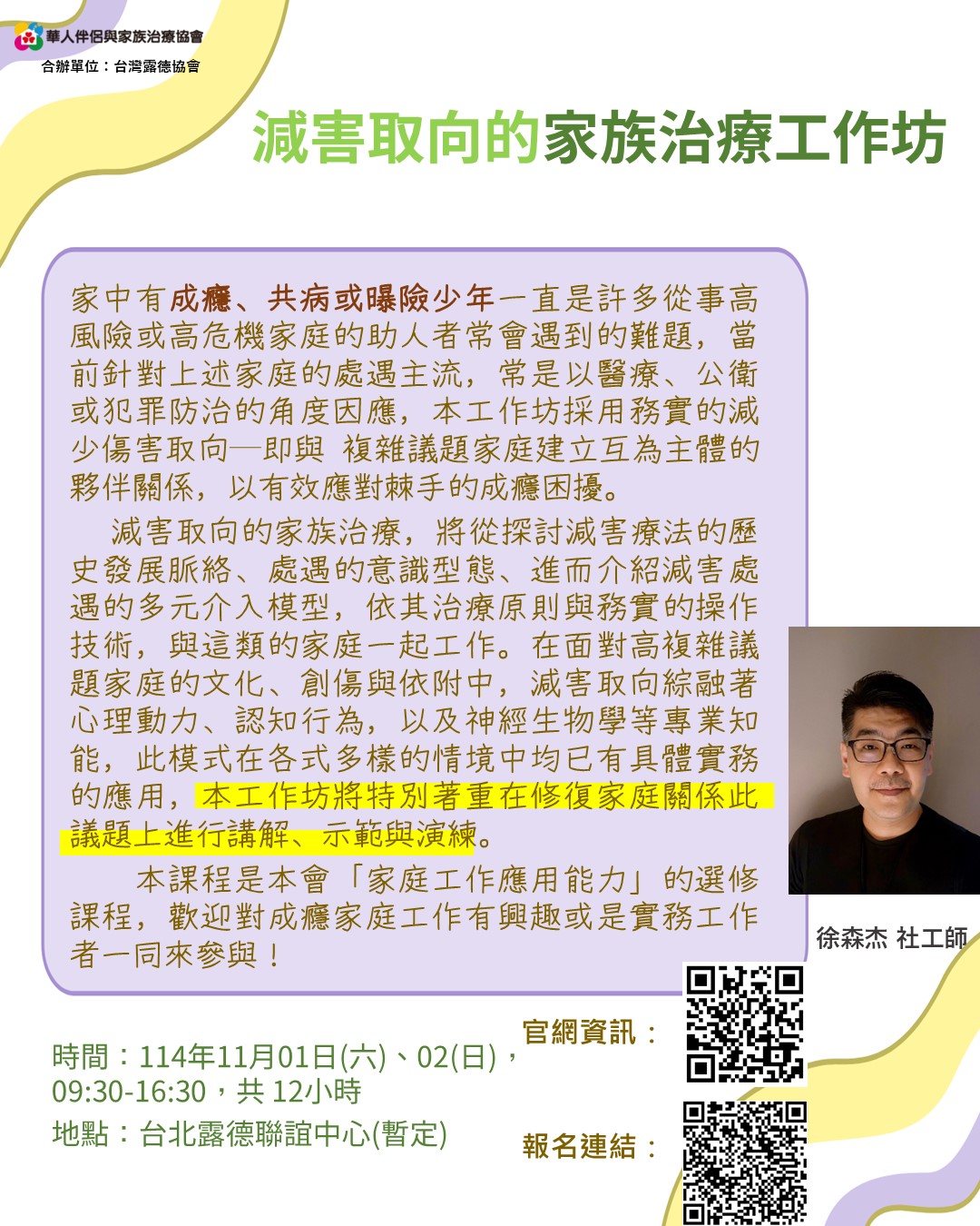 華人伴侶與家族治療協會−114.11.01-02 減害取向的家族治療工作坊